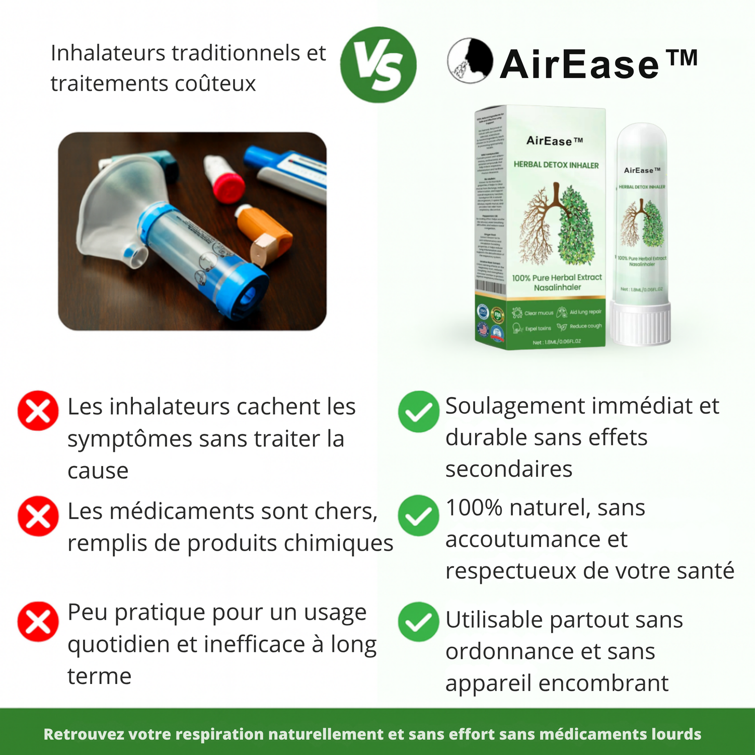 Contrairement aux solutions chimiques qui n'offrent qu'un soulagement de courte durée, AirEase™ agit en profondeur et libère les poumons – sans dépendance ni effets secondaires.