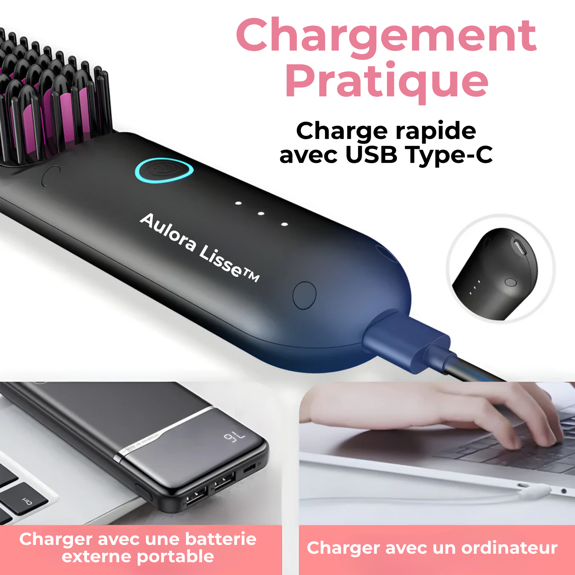 L'Aulora Lisse™ possède une batterie puissante qui permet plusieurs utilisations par charge. La durée exacte dépend du réglage de la température et du type de cheveux. Nous disons généralement qu'une charge complète offre environ 30 minutes ⏰ d'utilisation continue à 180C.