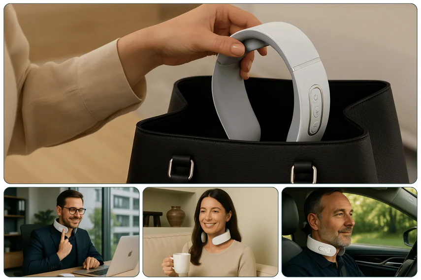Grâce à sa conception compacte et à sa batterie puissante 🔋, vous pouvez utiliser CerviRelax™ n'importe quand, n'importe où ! Il est conçu pour être utilisé dès que vous sentez la tension s'accumuler—que vous soyez au bureau 🖥️, à la maison sur le canapé 🛋️, ou même en déplacement 🚗. Utilisez-le simplement pour une session dès l'apparition des symptômes.