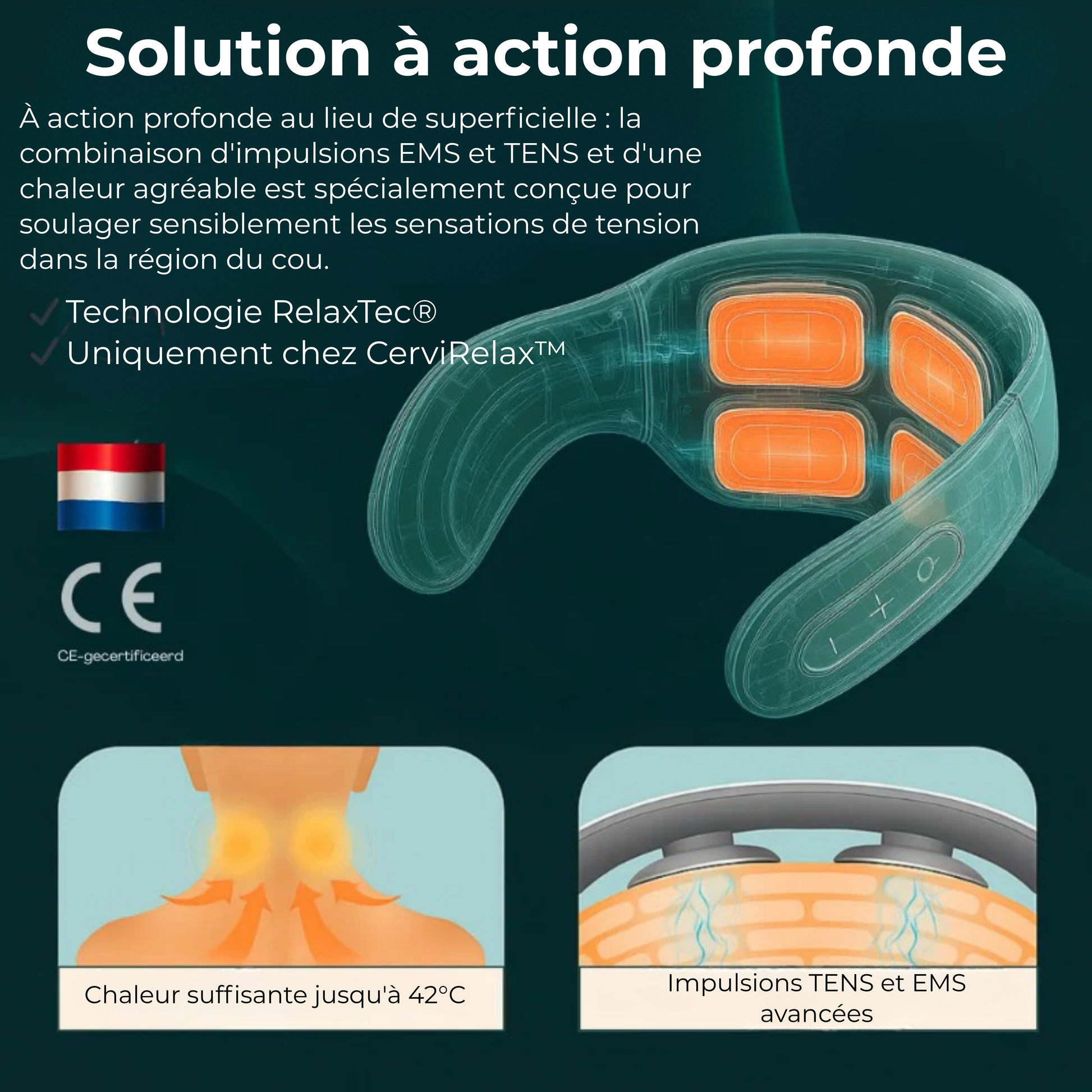La combinaison spéciale d'EMS ⚡ + chaleur 42°C 🔥 + impulsions TENS 💡 peut procurer une détente notable en cas de tension musculaire dans la nuque. C'est précisément pour ces 6 raisons que plus de 12 300 personnes utilisent CerviRelax™ : 👇