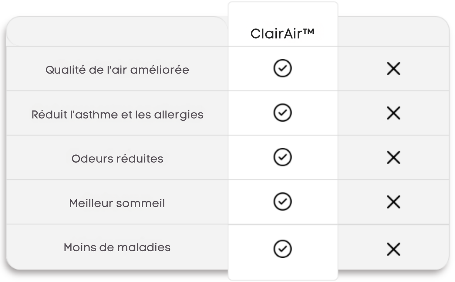 L'air intérieur peut être jusqu'à 5 fois plus pollué que l'air extérieur. Un purificateur d'air ClairAir™ nettoie l'air des bactéries et des produits chimiques nocifs dans votre maison, contribuant à un climat intérieur plus sain et prévenant les maladies. - Moins d'odeurs