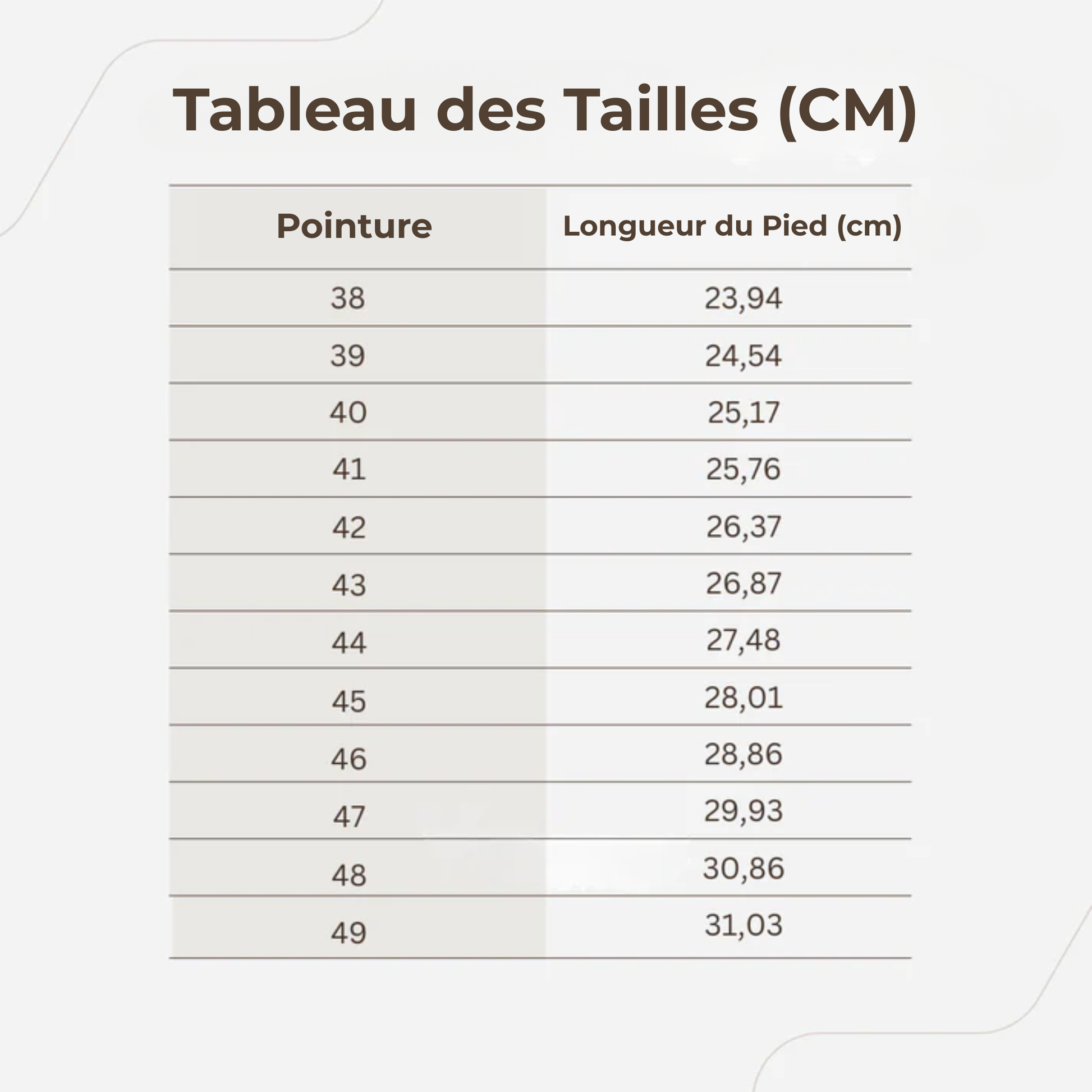 Nous recommandons de choisir une taille au-dessus de votre taille habituelle pour un ajustement parfait. Cela garantit que la large boîte à orteil et la semelle ergonomique ont suffisamment d'espace pour soutenir le mouvement naturel de votre pied et maximiser le confort.