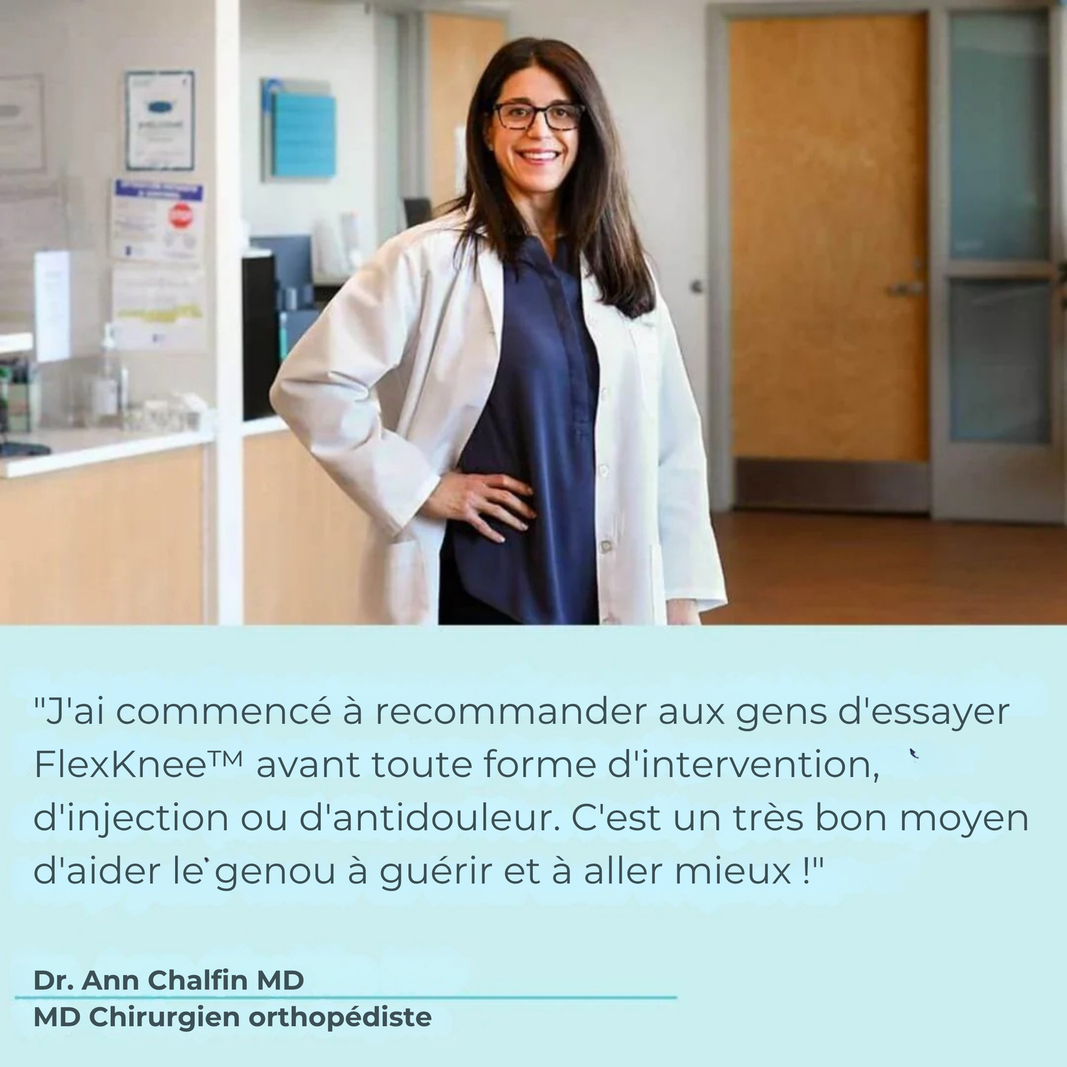 FlexKnee™ n'a pas seulement été testé par nos propres experts, mais a également été envoyé à des dizaines de médecins et de spécialistes renommés pour qu'ils l'essaient eux-mêmes – à la fois sur eux-mêmes et sur des patients souffrant des problèmes les plus graves.