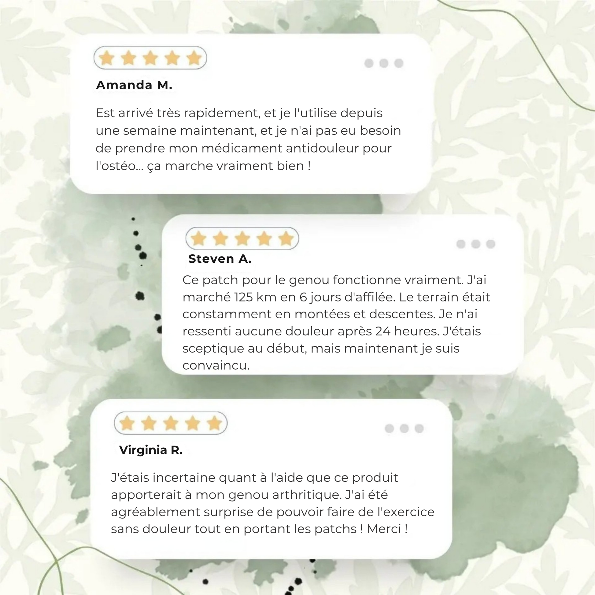 J'ai un genou abîmé, le ménisque a disparu et marcher est difficile et douloureux. Jusqu'à présent, les patchs semblent fonctionner incroyablement bien après les avoir utilisés quelques fois ! Le genou devient chaud, donc je suppose que les herbes font ce qu'elles sont censées faire ! Si vous avez déjà envisagé une opération, des injections ou des analgésiques – s'il vous plaît, essayez ceci d'abord...