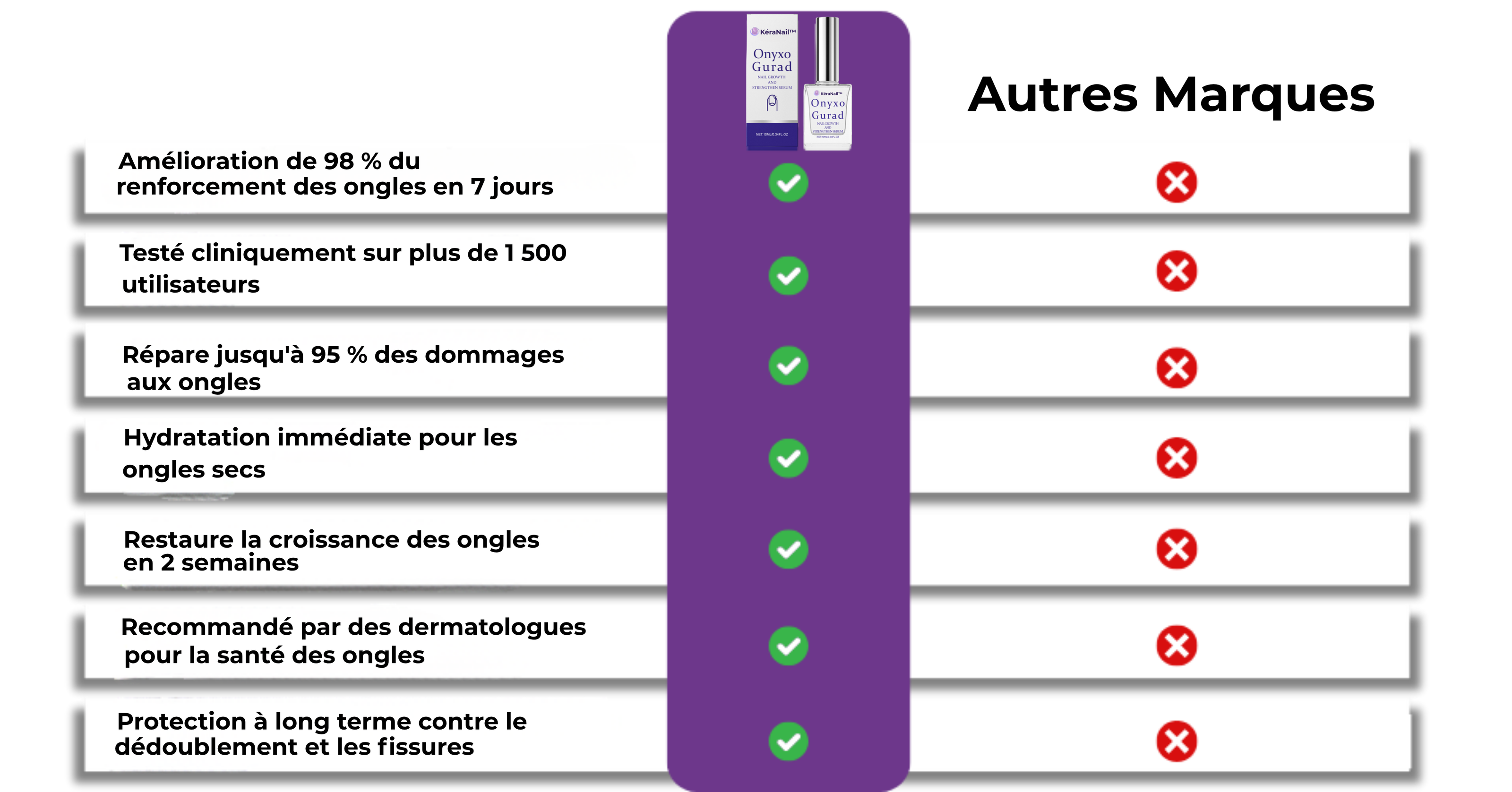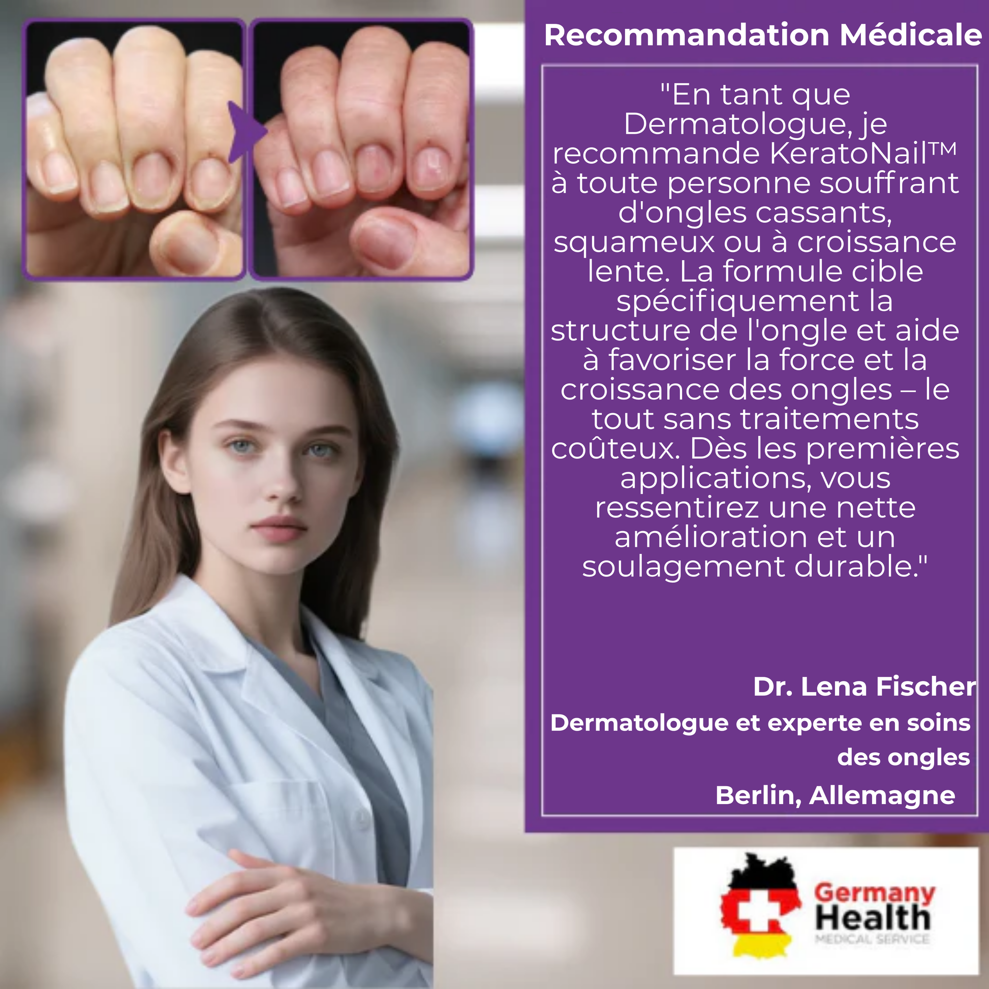 KéraNail™ est cliniquement soutenu par des experts en soins des ongles, garantissant des résultats sûrs et efficaces. 👍Approuvée par des professionnels de premier plan, la formule avancée vise à s'attaquer aux causes profondes des dommages aux ongles, offrant des résultats visibles en quelques jours seulement. ⏳Les dermatologues et les spécialistes des ongles le recommandent car il agit là où d'autres produits échouent, vous offrant de vrais résultats et une protection à long terme. 🛡️