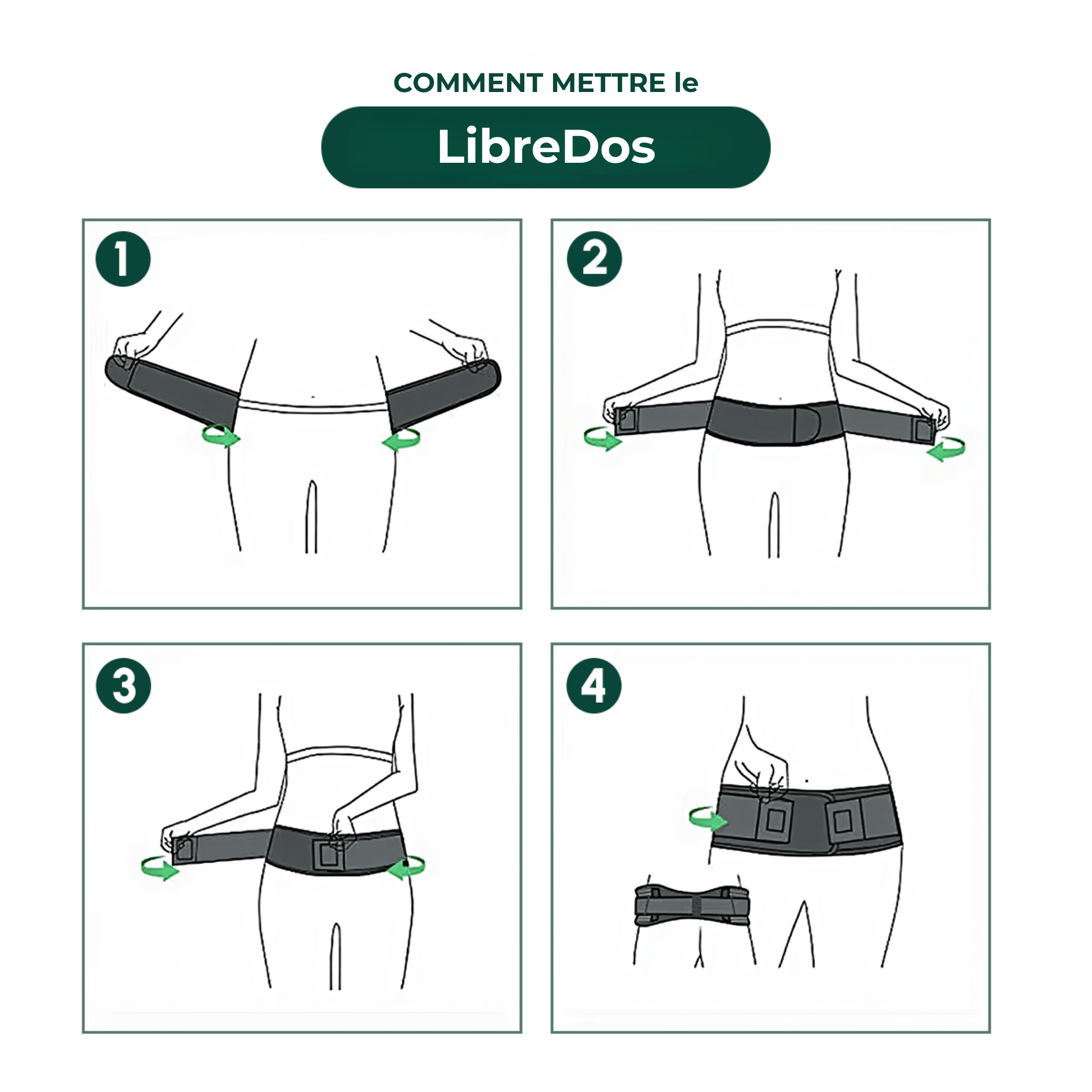 La ceinture de soutien dorsal LibreDos™ peut être portée toute la journée. Commencez par porter la ceinture pendant environ une heure, puis faites des essais pour voir quand et à quels moments vous avez besoin de soutien pendant la journée. La ceinture peut être portée aussi longtemps que vous en avez besoin et peut également être utilisée pendant l'activité physique ou pendant le sommeil et le repos.