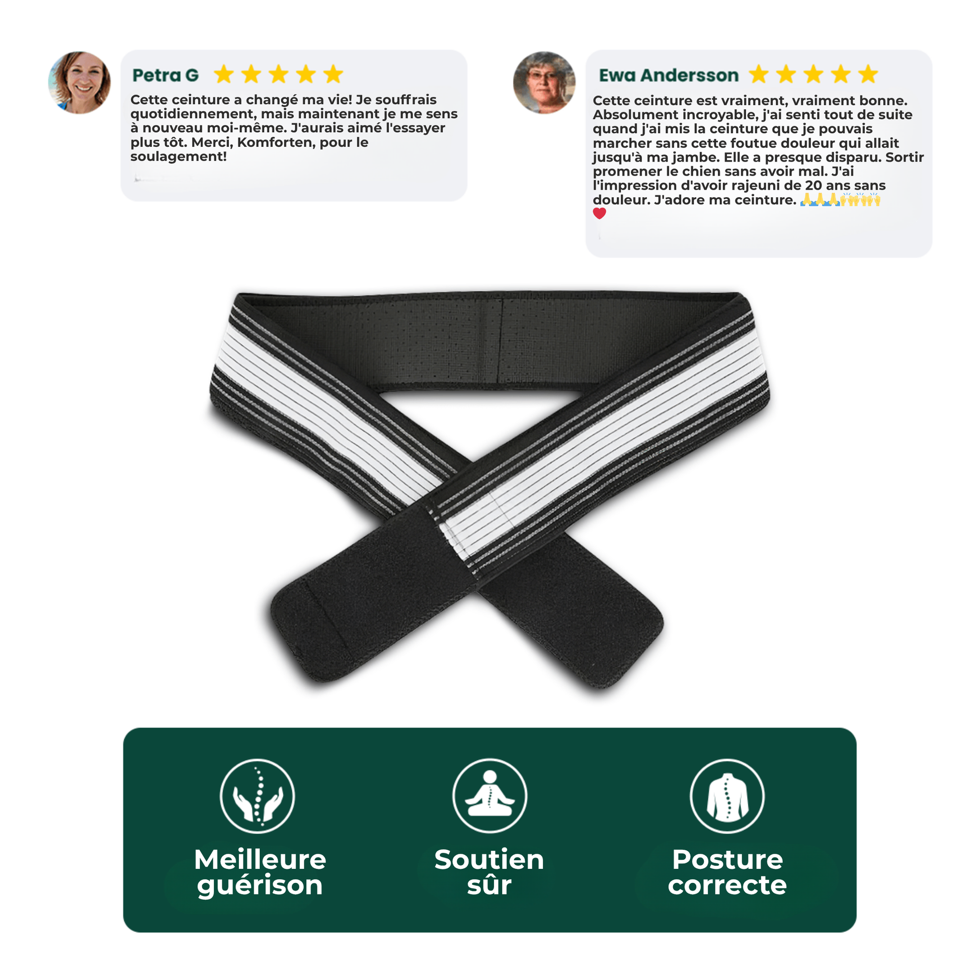 "J'ai essayé de nombreuses solutions contre ma sciatique, mais rien n'a donné de résultats durables. Dès le premier jour avec cette ceinture, ma douleur a immédiatement diminué ! Je la porte quelques heures par jour, et cela a permis à mon dos d'obtenir le soutien dont il avait besoin pour redevenir indolore !"