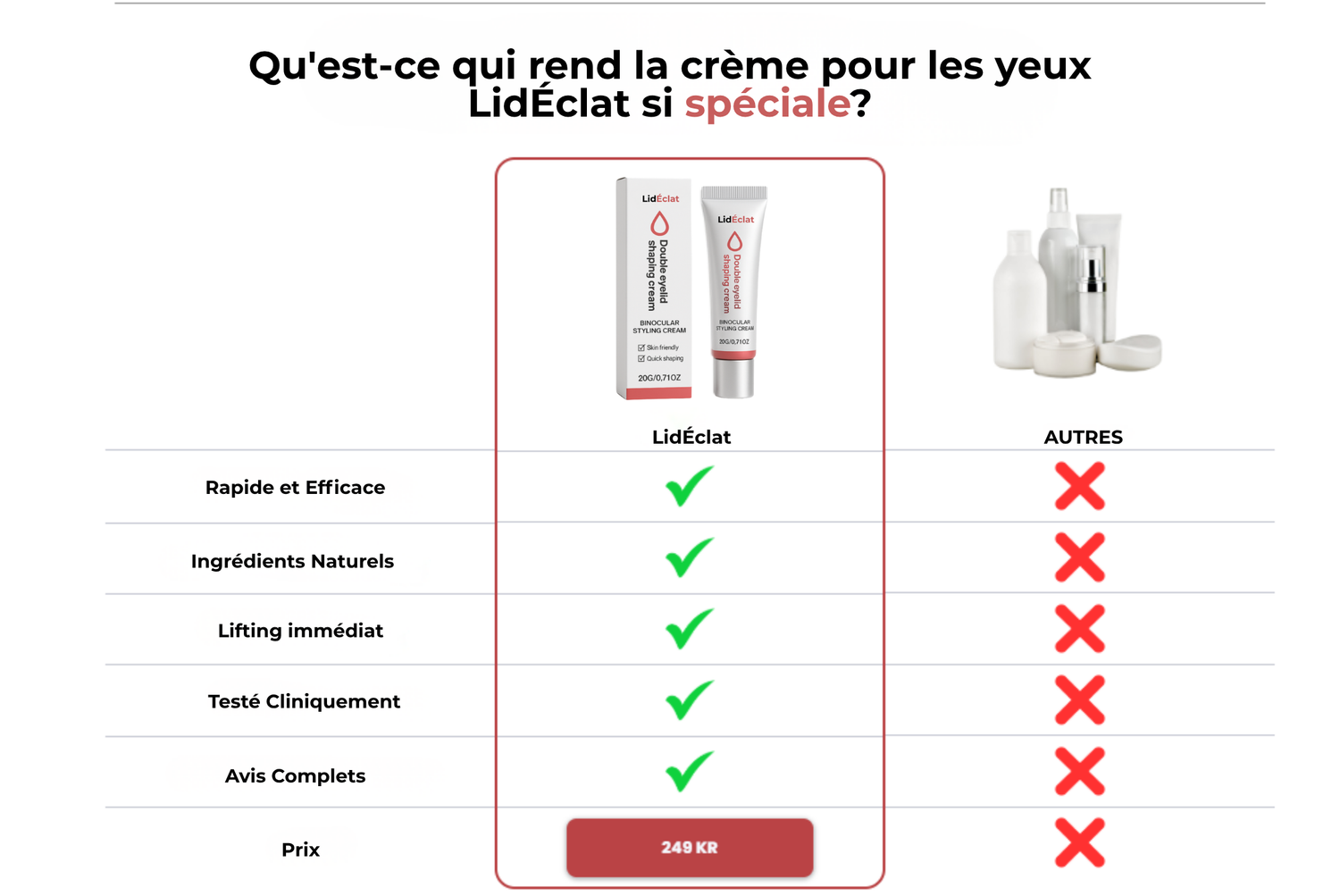 Réponse: LidÉclat est spéciale car elle offre une solution sans chirurgie 🚫🔪 pour les paupières tombantes, grâce à sa formule unique qui procure un lifting instantané et naturel.