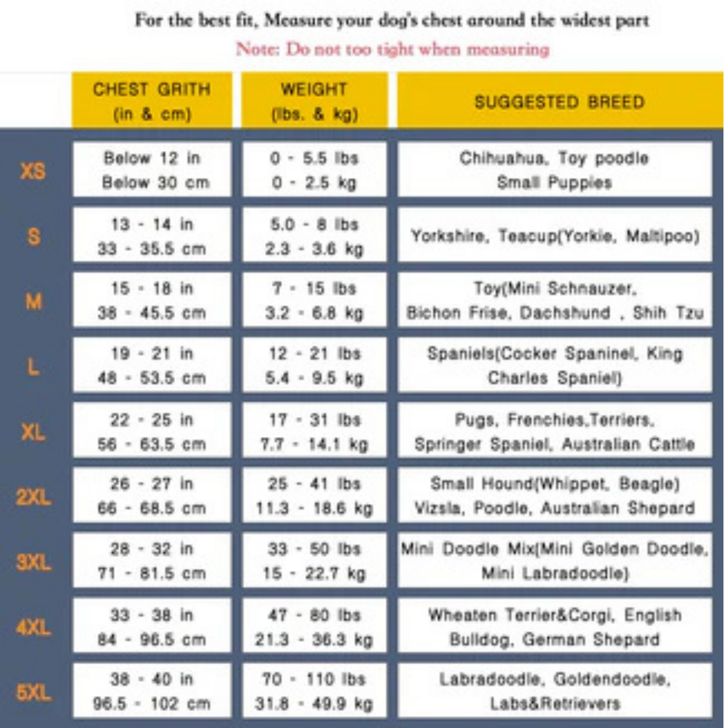 - Tailles Complètes : Disponible dans une large gamme de tailles pour s'adapter à presque tous les chiens : XS, S, M, L, XL, XXL, 3XL, 4XL, 5XL.
