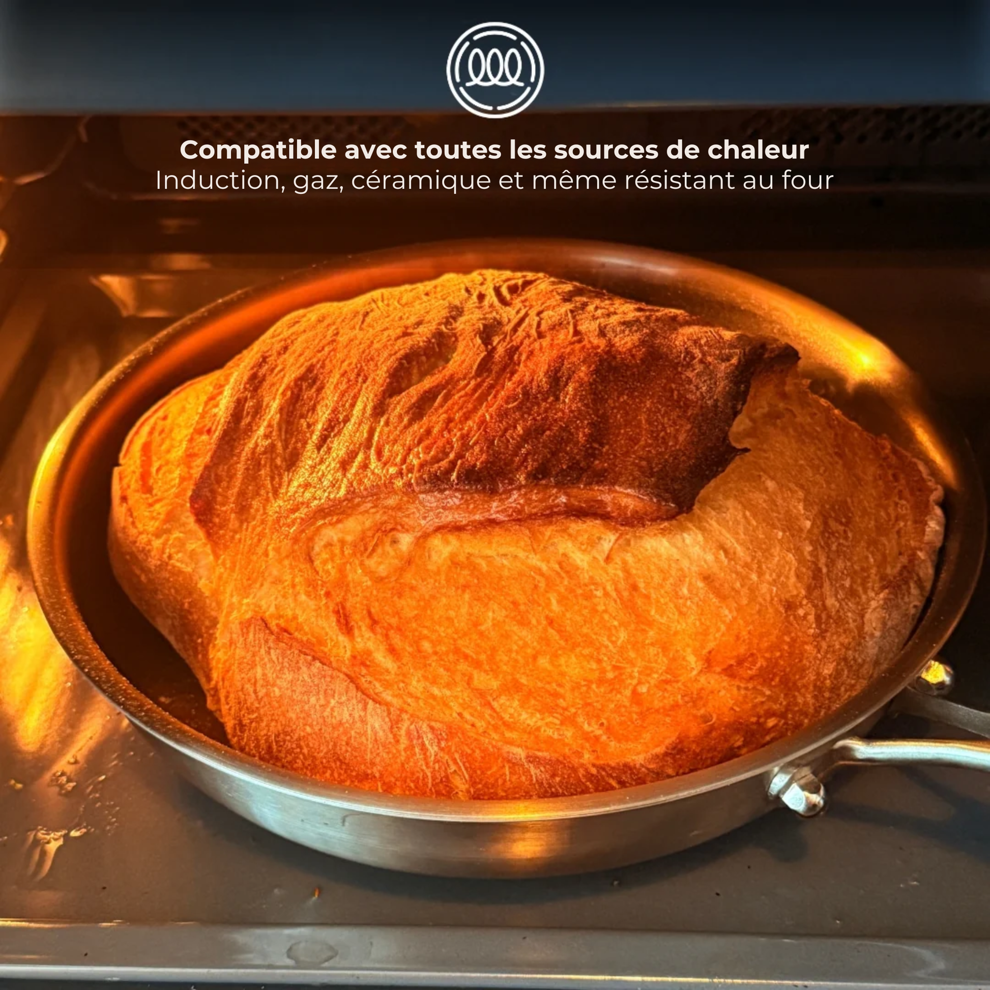 - Couche Inférieure : 0.6 mm d'acier inoxydable (430), la rendant compatible induction et magnétique.