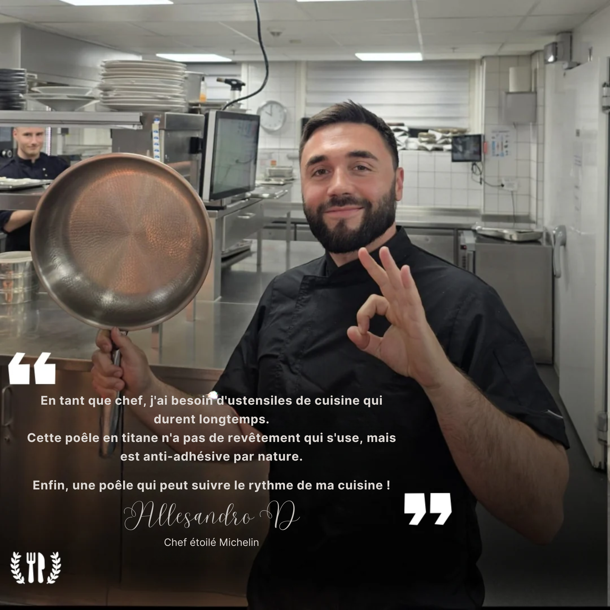 "En tant que chef, j'ai besoin d'ustensiles de cuisine qui durent. Cette poêle en titane TitaneForma™ n'a pas de revêtement susceptible de s'user, mais elle est pourtant naturellement anti-adhésive. Enfin, une poêle qui peut suivre le rythme de ma cuisine !" 🧑🍳💪